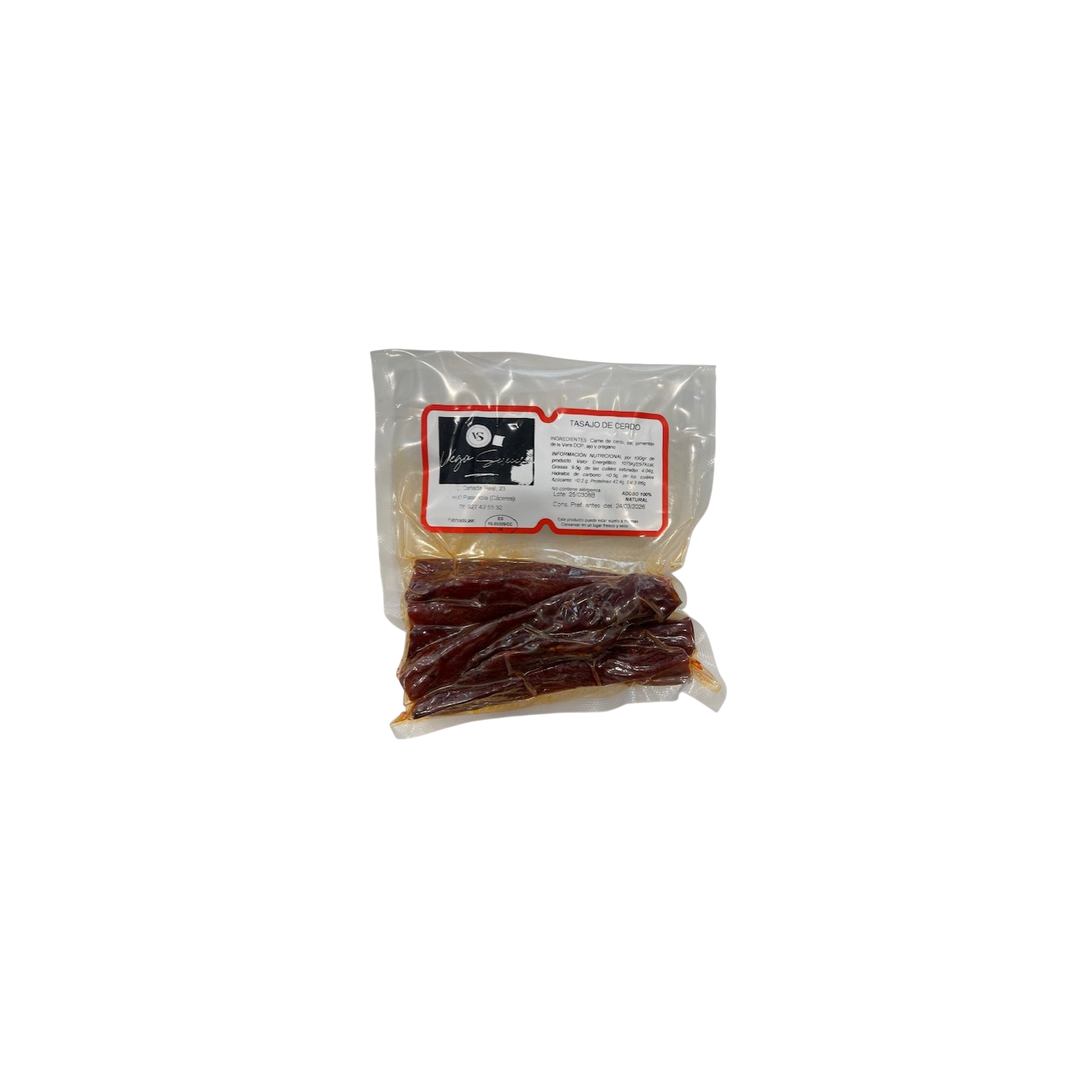 El tasajo es un alimento ancestral del norte de Extremadura cuyo origen nos remonta a las piaras de cerdo verata de la Sierra de Gredos. En vega selección lo elaboramos con magro de paleta de cerdo consiguiendo así una textura más tierna conservando la receta tradicional elaborada a base de pimentón de la Vera DOP agridulce, ajo, sal y orégano. Te lo ofrecemos envasado al vacío en paquetes de 300 grs para que puedas disfrutarlo hecho taquitos como aperitivo.
